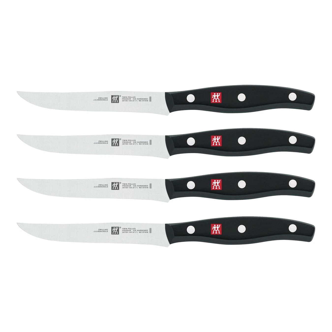 El juego de chuleteros de la serie Twin Pollux se compone de cuatro cuchilllos. Los mangos ergonómicos son muy cómodos de asir reduciendo así el esfuerzo necesario al cortar. Un endurecimiento especial al frío asegura a los cuchillos FRIODUR óptimas cualidades de corte y durabilidad. Gracias a su material ligero y endurecido, la hoja corta buey, cerdo y muchos otros alimentos deliciosos.