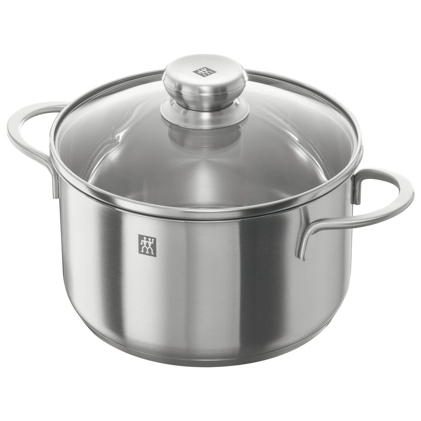 La batería de cocina de acero inoxidable Twin Nova incluye todo lo necesario para preparar una amplia variedad de platos. La tapa es de cristal para que pueda ver fácilmente el interior y el estado de cocción del plato. La completa batería de cocina Twin Nova está contiene dos ollas de 20 cm (una alta y una mediana), una olla de 24 cm, un cazo sin tapa de 16 cm y una rustidera con dos asas de 24 cm. Prepare sus platos favoritos cómodamente con esta batería de cocina Zwilling.