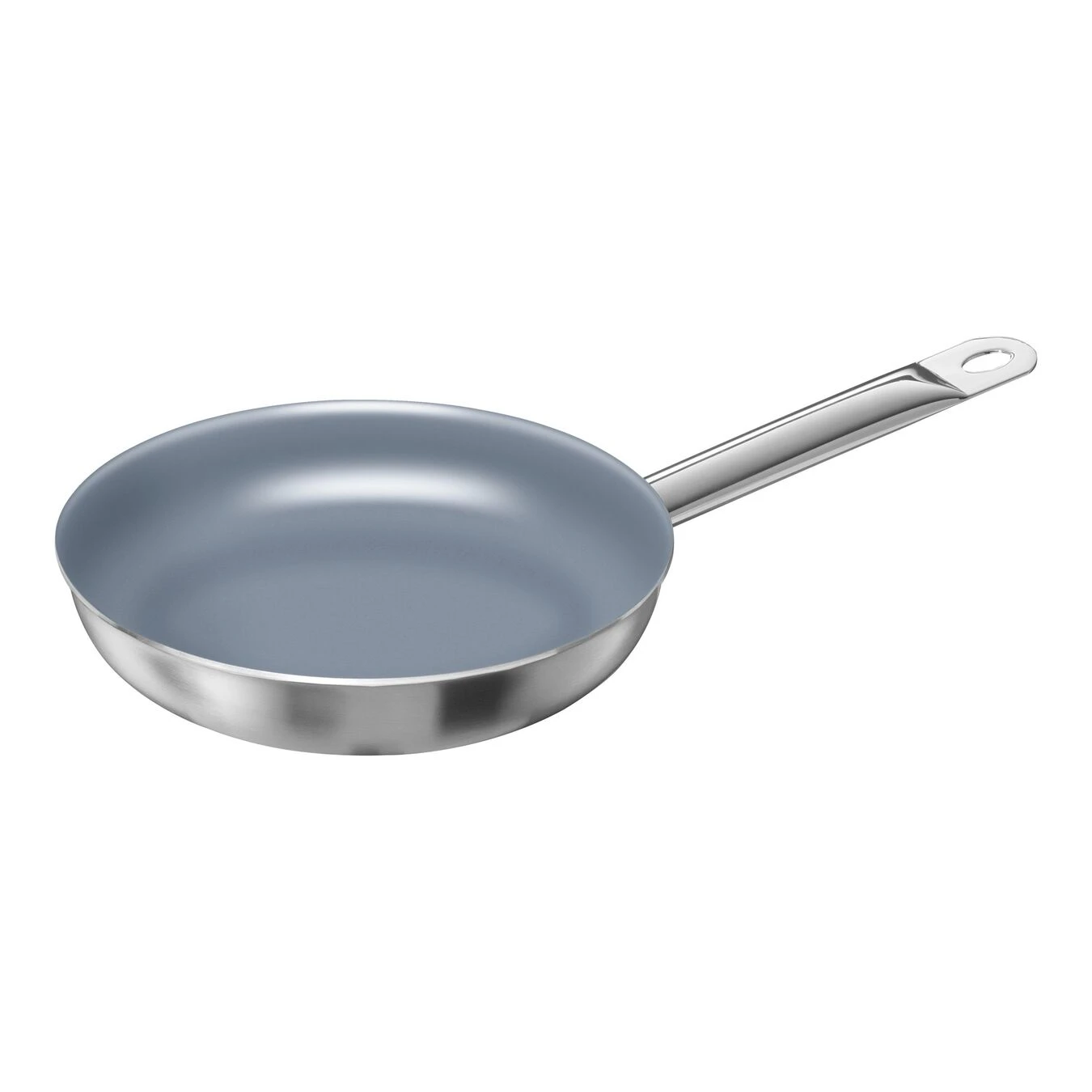 Esta sartén tiene un diámetro de 20 cm y es apta para todo tipo de cocinas, incluso las de inducción. Como todos los recipientes con revestimientos es aconsejable el lavado a mano. Su base está formada por un núcleo de aluminio recubierto por dos capas de acero inoxidable. El núcleo garantiza que el calor se distribuya rápida y uniformemente, lo que permite apagar antes la fuente de calor.
